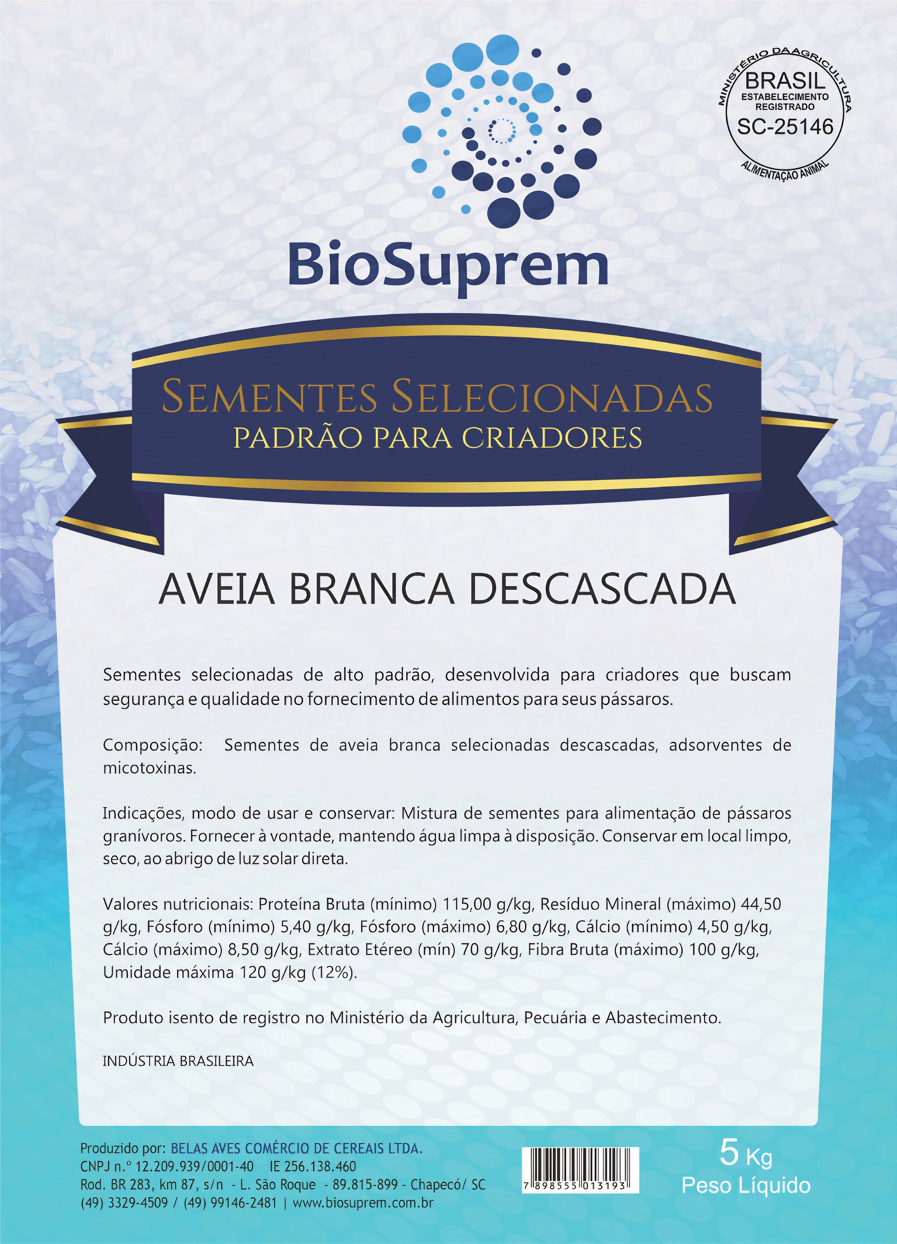 Sementes puras de aveia branca descascada, especialmente selecionadas para o padrão de exigência dos criadores.